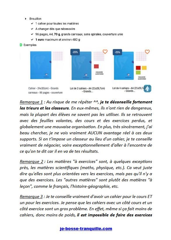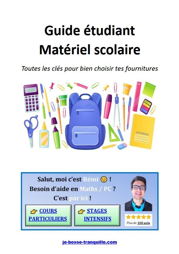 Le guide te donne une liste détaillée et optimisée pour chaque type de matériel : cahiers, trousse, sac, calculatrice…