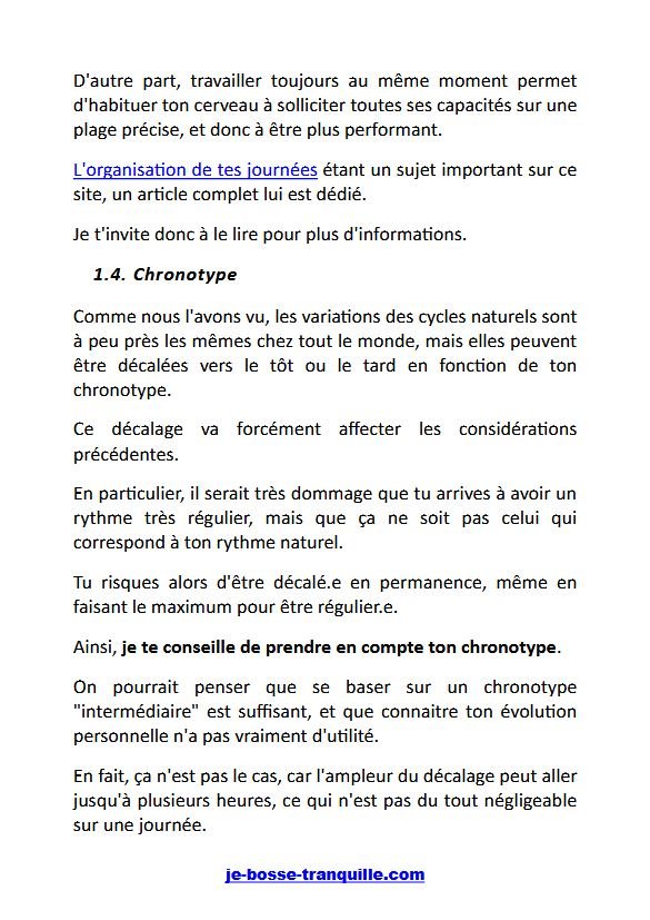 Tu découvriras comment éviter les perturbateurs de tes rythmes (écrans, mauvaise alimentation…) et comment positionner intelligemment ton travail personnel pour être ultra-productif.