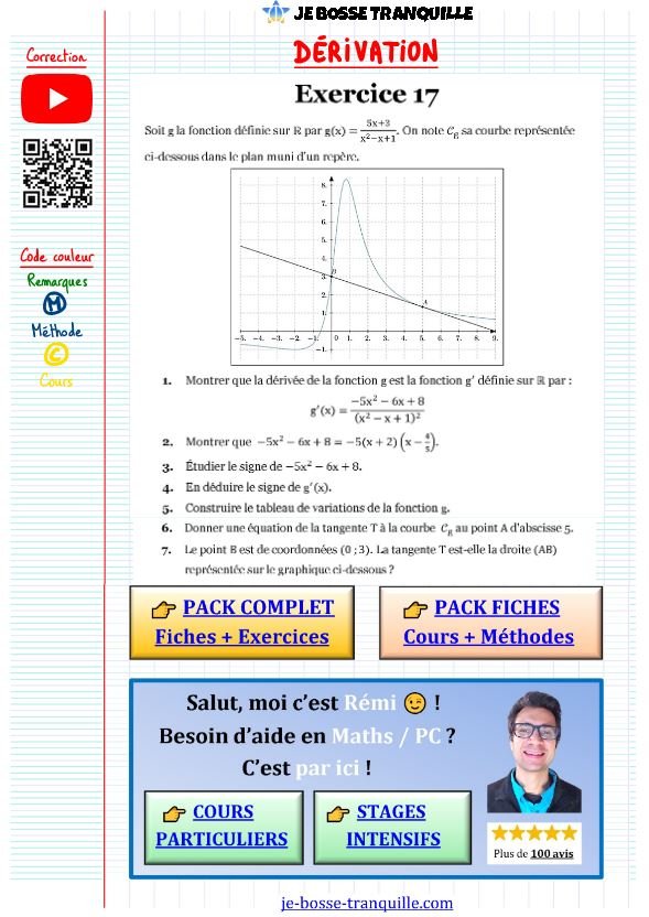 Cet exercice derivation globale te propose une étude complète d’une fonction rationnelle g(x) = 5x+3/(x²-x+1), de sa dérivée à son tableau de variations.
