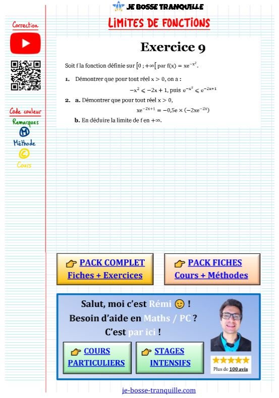 🌀 Cet exercice limite de fonction terminale t’entraîne à manipuler des inégalités et le théorème d’encadrement avec une fonction exponentielle complexe !