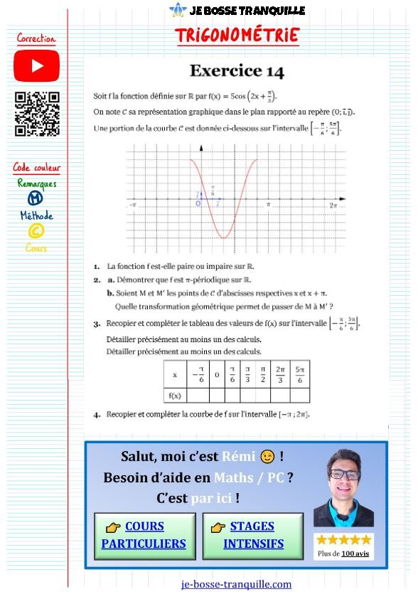 Cet exercice math trigonométrie te propose une étude complète d’une fonction trigonométrique f(x) = 5cos(2x+π/3), alliant analyse théorique et représentation graphique.