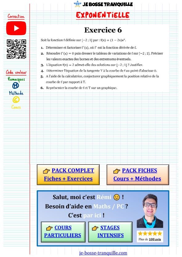 Tu vas analyser f(x) = (1-2x)e^x sous toutes ses coutures, du calcul de dérivée aux représentations graphiques.