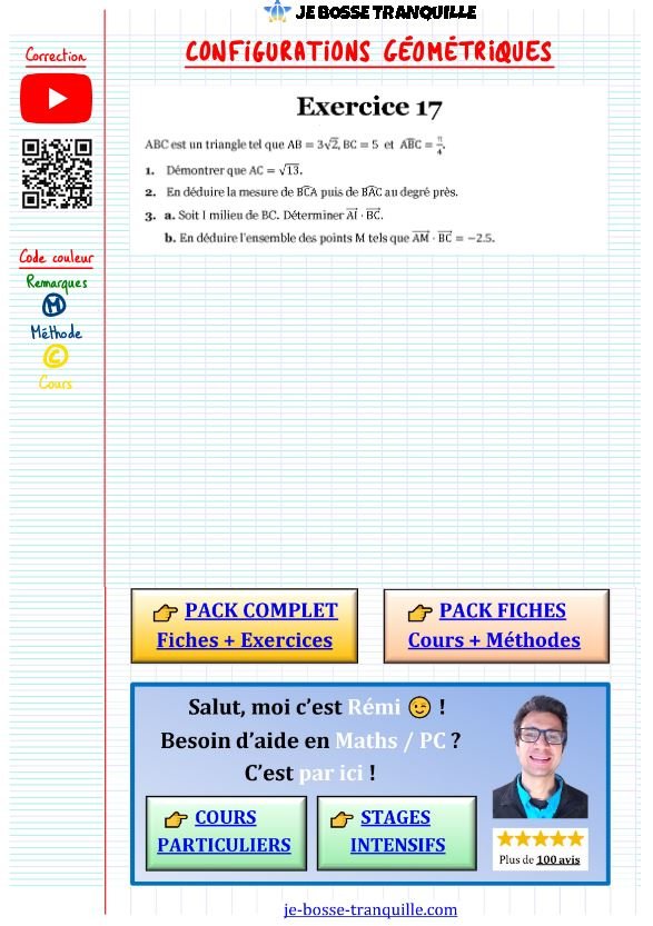 L’exercice se termine par l’identification d’une droite comme lieu des points M tels que AM→⋅BC→=−2,5\overrightarrow{AM} \cdot \overrightarrow{BC} = -2,5 , en utilisant le théorème de la médiane de façon astucieuse.